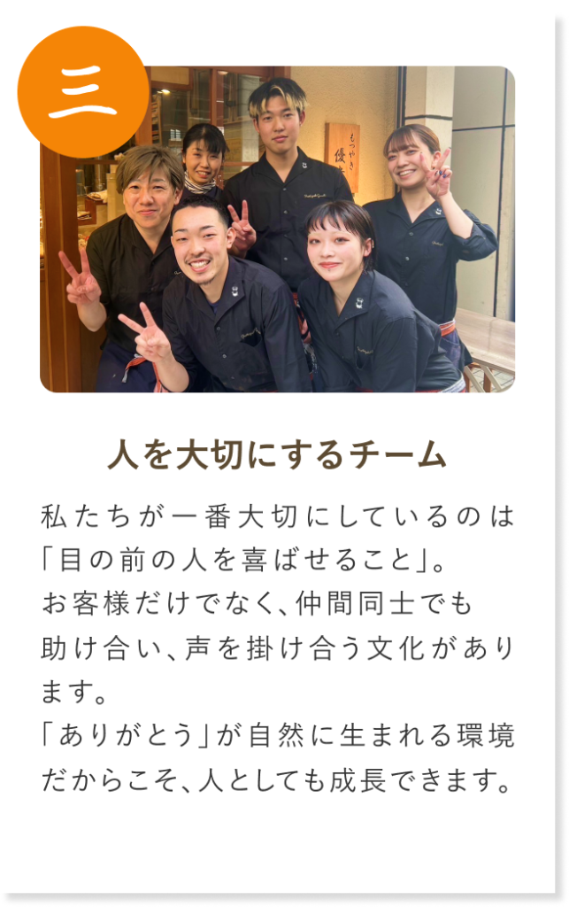 私たちの店には明るく前向きなスタッフが集まっています。誰に対してもプラスの気持ちで